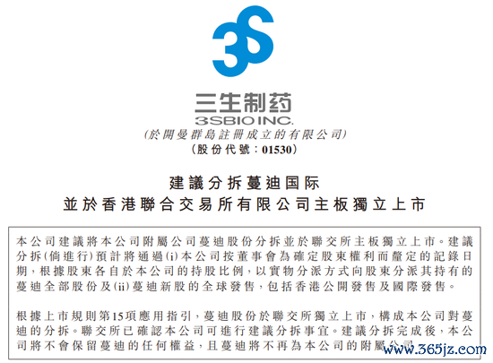 11月20日晚间,三生制药公告,拟将其附属公司蔓迪国际分拆至港交所主板独立上市,港交所已确认可进行该分拆事宜。分拆完成后,三生制药将不会保留蔓迪国际的任何权益。