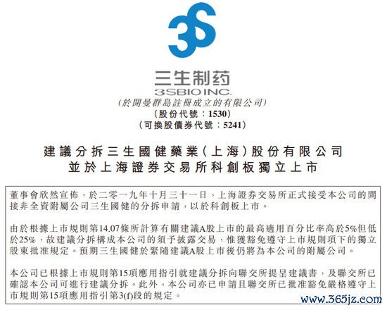 2019年10月31日,三生制药公告,上交所已正式接受其间接非全资附属公司三生国健的分拆申请。三生制药董事认为,此次分拆能够量化三生国健股权的市场价格、并为其提供新的资金来源,同时能提升三生制药及三生国健的知名度。