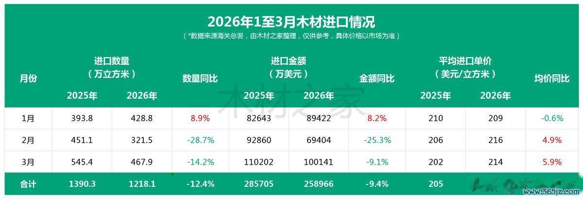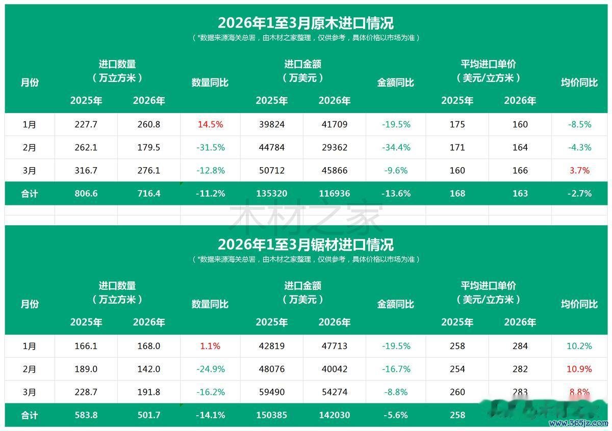 综合来看,2026年一季度(1-3月)我国木材进口总量为1218.1万立方米,同比下降12.4%;进口金额约25.9亿美元,同比下降9.4%。
