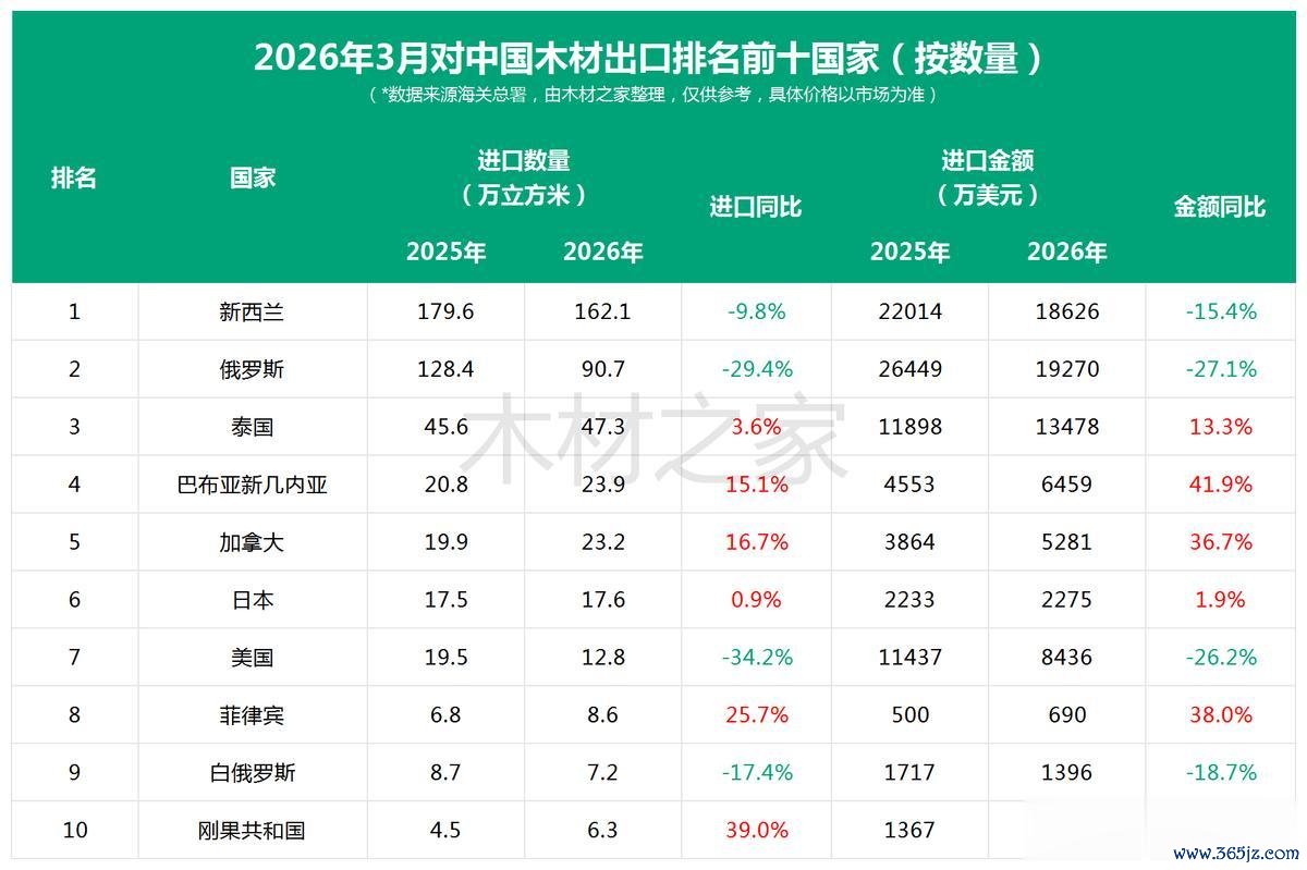刚果共和国成为最大亮点,3月对华出口量达6.3万立方米,同比增长39%,位列前十供应国增幅首位。