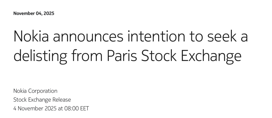 当地时间11月4日,诺基亚官方宣布,公司有意从巴黎泛欧证券交易所退市。